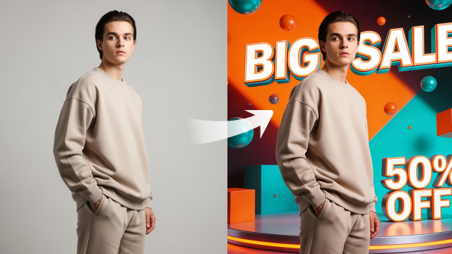 Im Gegensatz zu einfachen Überlagerungen passt KI-Poster automatisch die Beleuchtung und Farbtemperatur des Motivs basierend auf dem Umgebungslicht an, wenn Hintergründe generiert werden, um realistische und natürliche Composite-Effekte zu gewährleisten.