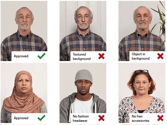 A: Religious and medical head coverings are generally allowed. Keep your full face visible from chin to forehead with edges visible on both sides, and avoid shadows on the face.