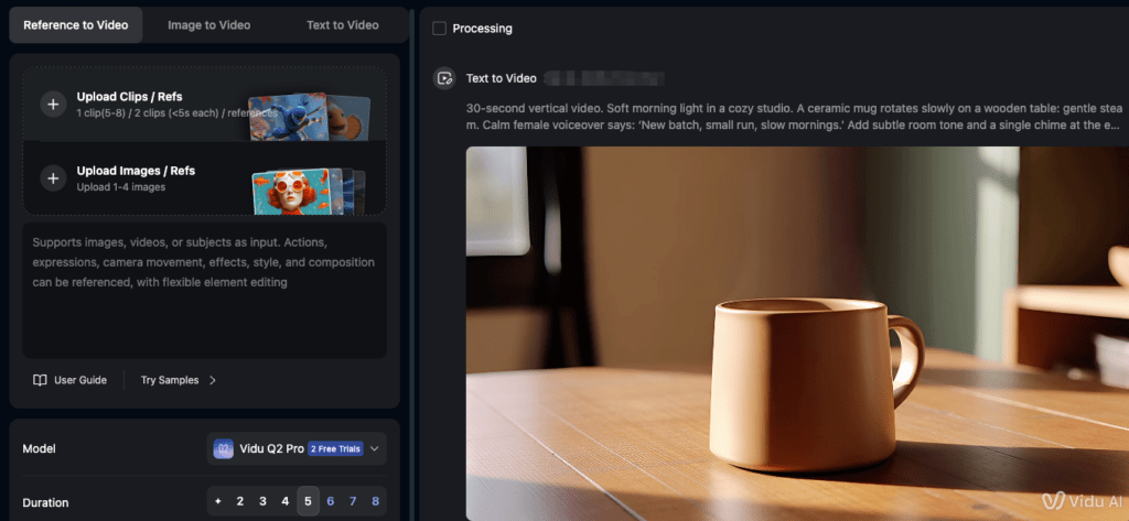 Vidu Q2 Pro: stronger reference control. When I fed it a brand board, a hero product angle, or a specific motion cue, Q2 Pro held the look. Colors stayed faithful, logos kept their proportions, and camera moves repeated cleanly across iterations. I know “consistency” sounds boring, but if you’ve ever tried to match a Tuesday cut to a Friday cut, oof, you’ll appreciate it.