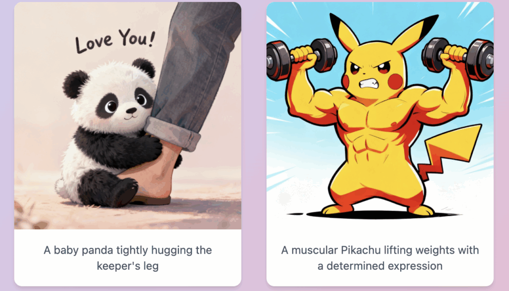 - Prompt: “A muscular Pikachu lifting weights with a determined expression” .